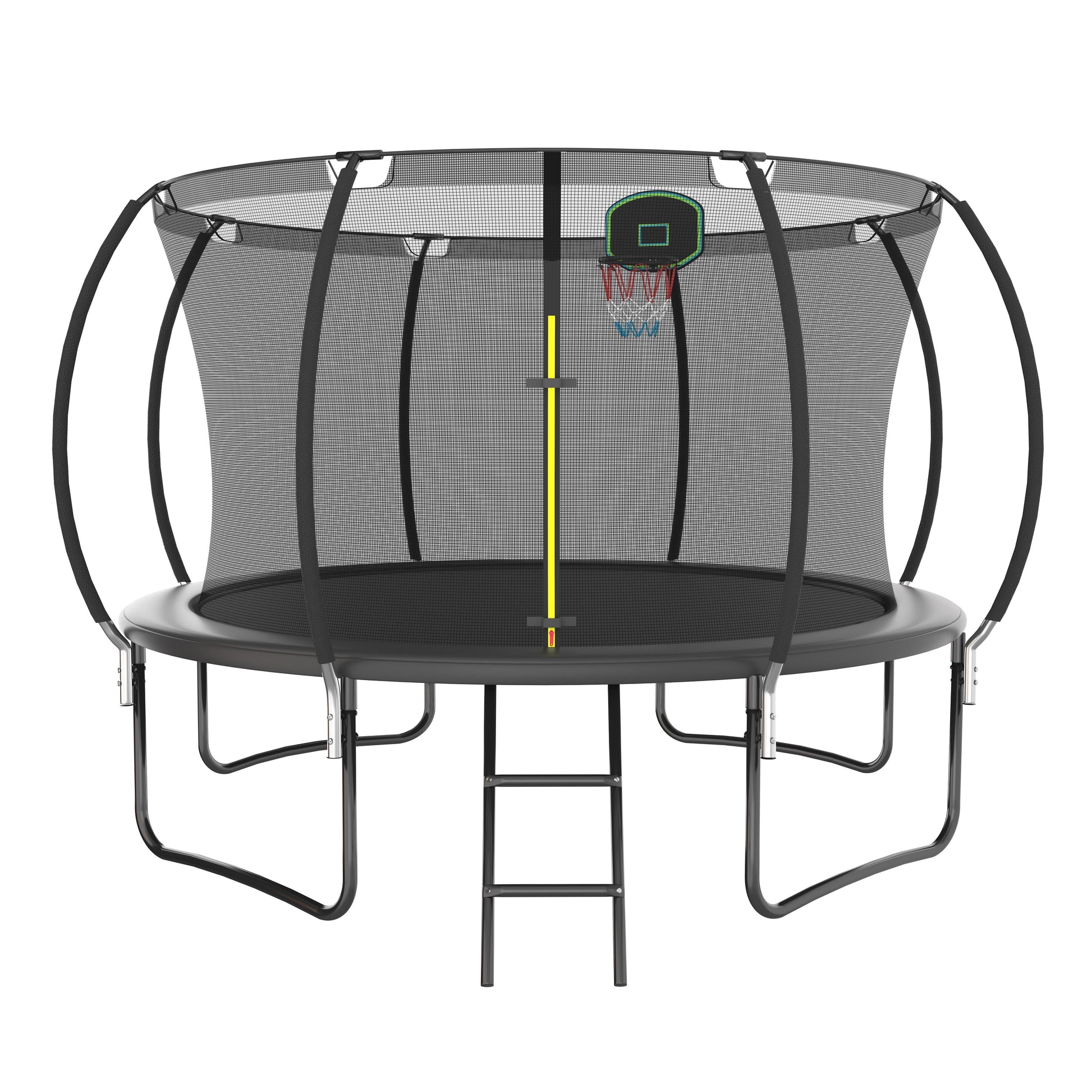 Specification-- 12FT Trampoline with Basketball Hoop-- Materials: UV-resistant PP spring pad, Weather-resistant galvanized steel, Durable PE net-- Max Weight Capacity: 300LBS-- Ladder and zipper help to quickly enter the trampoline-- 4 U-shaped support legs are evenly distributed for more stable construction-- 360¡ã Enclosure net and no gap design provide a safe sports environment