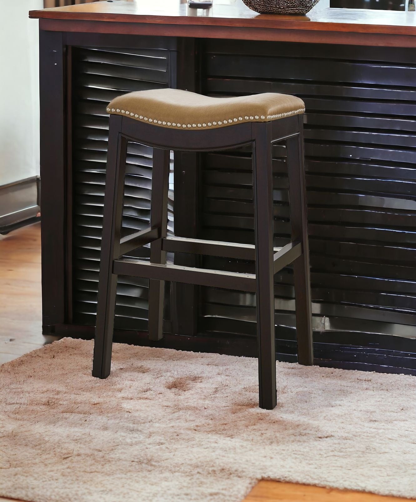 Comfort and design come together nicely in this 31-inch tan and espresso faux leather and solid wood backless counter height bar chair with footrest. The espresso coloration of the high quality solid wood base marries nicely with the tan faux leather seat. The saddle shape of the seat give this backless chair a fresh and fashionable look. Designed with a footrest for comfort and convenience. 31-inch H x 20-inch W x 14-inch D