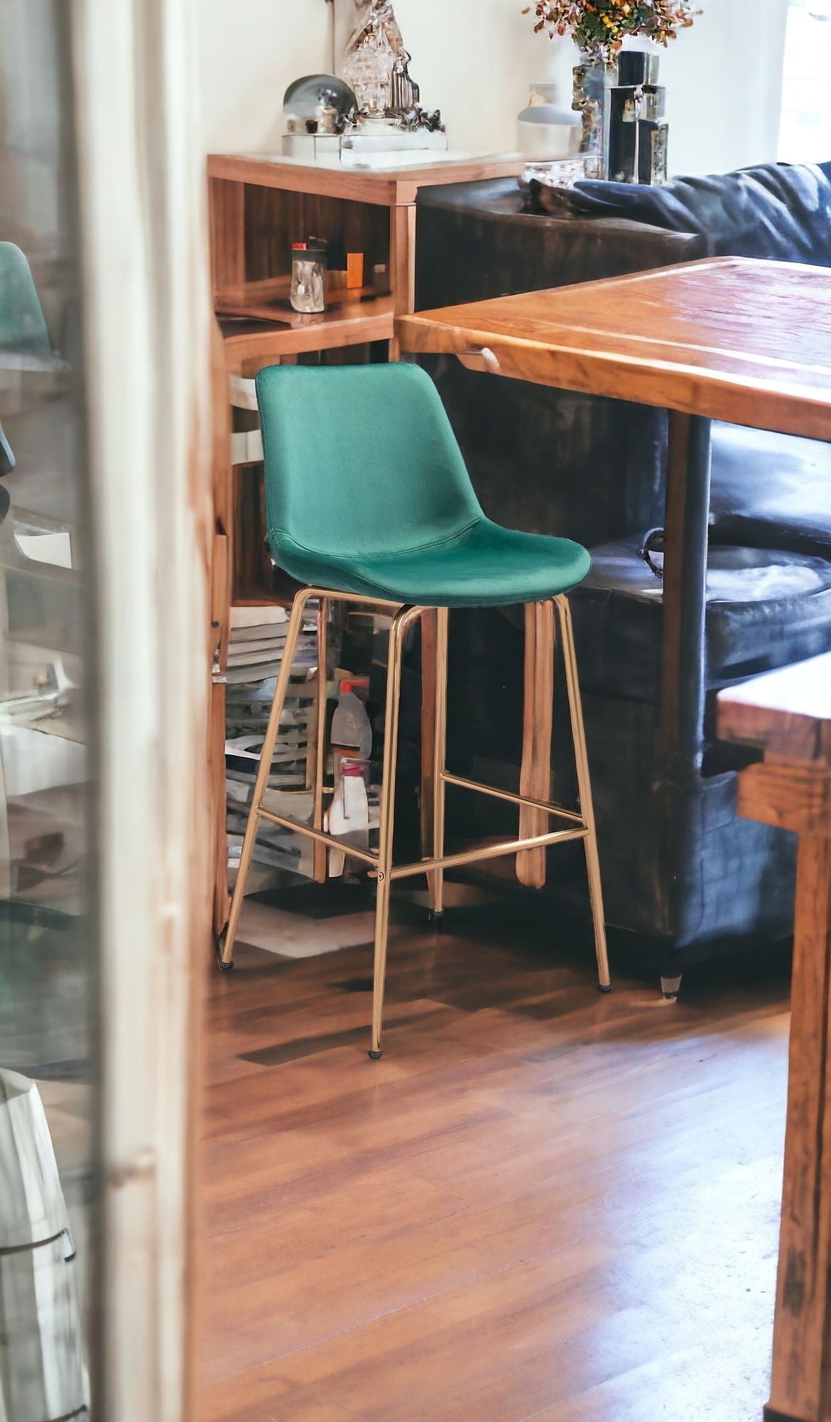 This 31-inch green and copper steel low back bar height bar chair with footrest will be the perfect way to add some cool design and utility to your space similar to what you find in your favorite cafes or pubs. The green upholstered seat of this stool is a nice contrast to the high quality, copper steel of the base. The bucket shape of the seat combines with a low back to give this chair a comfortable and fashionable look. Designed with a footrest for comfort and convenience. 43.1-inch H x 20.5-inch W x 22.2-inch D