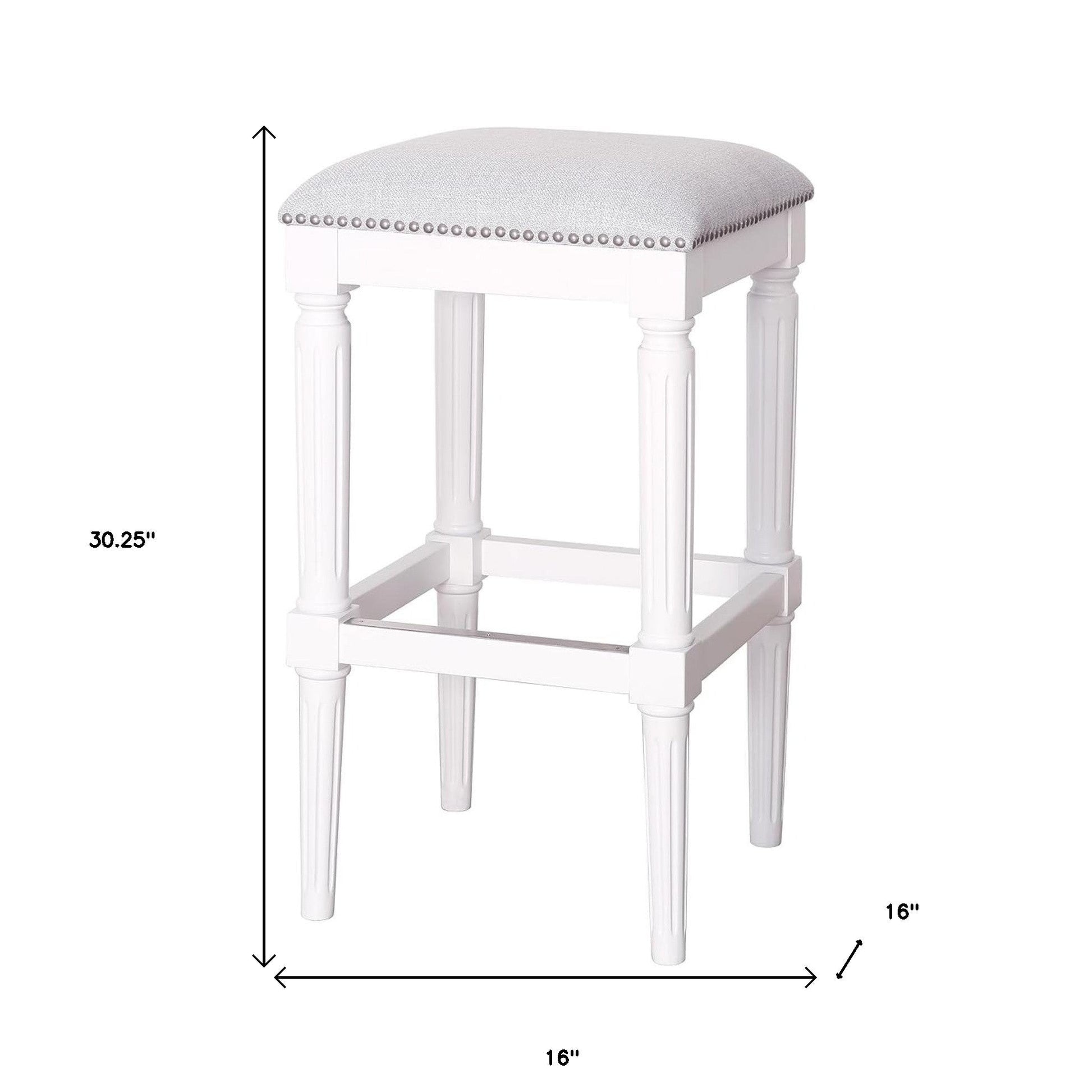 With this 31-inch gray and antiqued white solid wood backless bar height bar chair with footrest you can add design and extra seating to your space. Quality construction from antiqued white solid wood combines with gray upholstered to give this stool a fresh and updated look. A backless mixed with a square shaped seat makes this chair both comfortable and fashionable. Designed with a footrest for comfort and convenience. 30.25-inch H x 16-inch W x 16-inch D