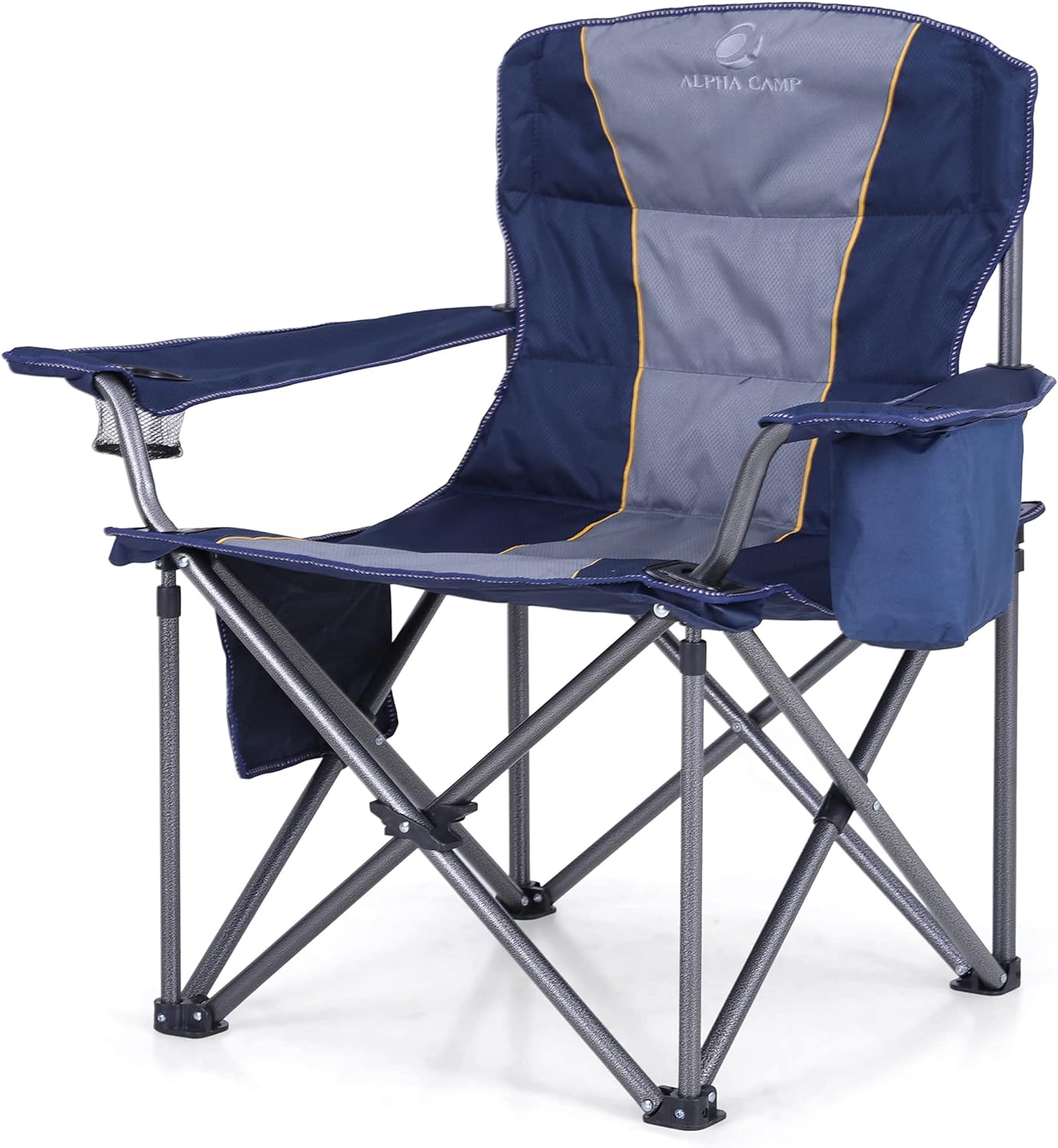 ALPHA CAMP Oversized Camping Folding Chair Heavy Duty with Cooler Bag Support 450 LBS Steel Frame Collapsible Padded Arm Quad Lumbar Back Chair Portable for Lawn Outdoor,Blue