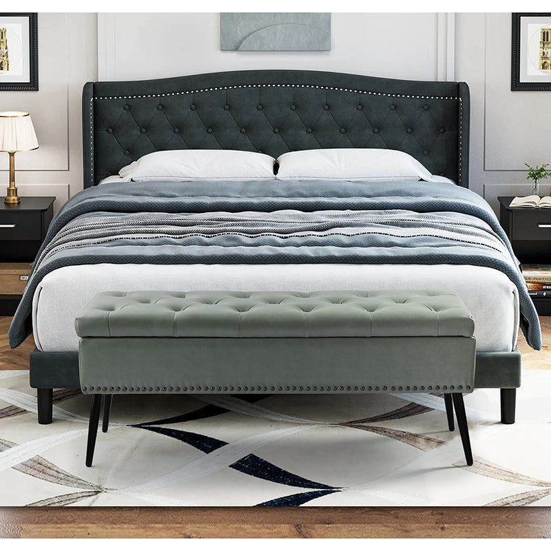 Whether you're making a statement at the entrance or decorating the foot of your bed, this transitional storage bench is the chic, sophisticated piece you've been looking for. This sturdy manufactured wood frame is wrapped in faux leather and padded with foam for supreme comfort that will make you forget about being tired after a long day at work. The nail head trims on the body of the bench provide an extra touch of vintage. Lifting the button-tufted design of the seat reveals ample internal storage space. The metal legs flare out slightly as a beautiful extension of the bench's silhouette. While it's sure to spruce up your ensemble shining solo, you can make it even more marvelous by tossing on a tassel-trimmed throw blanket. This storage bench is a combination of modern and industrial style that will last for years in your home.