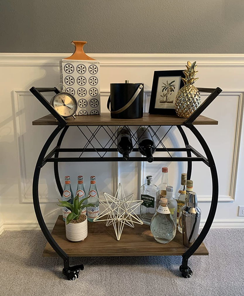 - Spacious Shelves to Hold More Items and Utility Bar Cart with Wine Rack to Prevent Oxidation: The industrial coffee cart table is designed with spacious tabletop and 2 tiers shelves to hold your coffee maker, wine and snacks for parties. Comes with a wine rack which hold up to 3 bottles of wine horizontally to keep the cork wet and prevent oxidation.