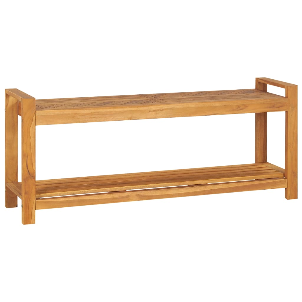 This wooden bench, with a rustic look, will make a great addition to your indoor or outdoor living space. The garden bench is made of solid teak wood, making it stable and durable. The slatted design makes the storage bench easy to clean and suitable for outdoor use. It also features a bottom shelf to provide ample storage space.