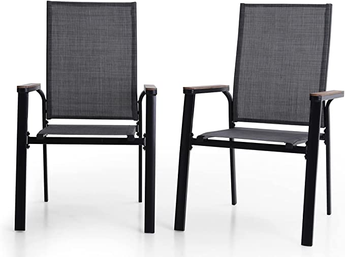 PHI VILLA Dining Chairs with elegant and classic black design brings unique aesthetic feeling to your patio, lawn, garden. Powder-coated aluminum frame and rust and weather resistant ensure long-lasting outdoor use. The ergonomic design with durable Textilene fabric helps reduce muscle tension and stress, enables users to feel no fatigue after a long time sitting on these chairs. Perfect for having dinner or party with your friends and family for all seasons.