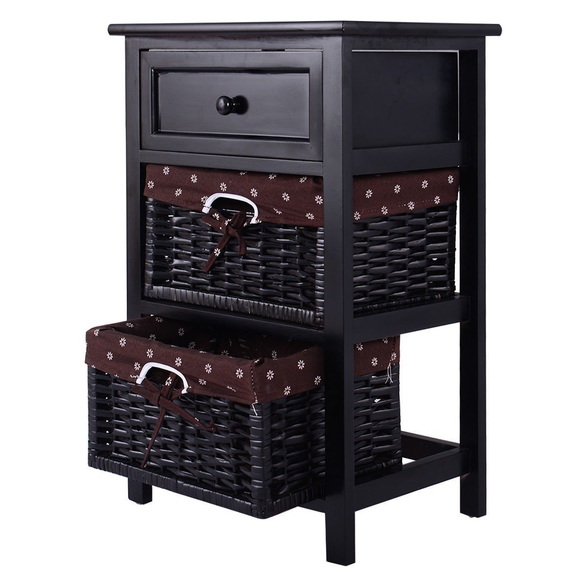 Black Wood 1-Drawer End Table Nightstand with 2 Storage Baskets High quality and brand new 3-tire night stand, including 1 drawer and 2 baskets Easy-glide drawer with safety stops Solid wood construction, durable and sturdy 2 withdrawable storage boxes provide additional storage One drawer with handle Stain resistant and easy to clean Color: White/Black Material: Paulownia wood and MDF panel Package includes: 1 x 3-tier night stand