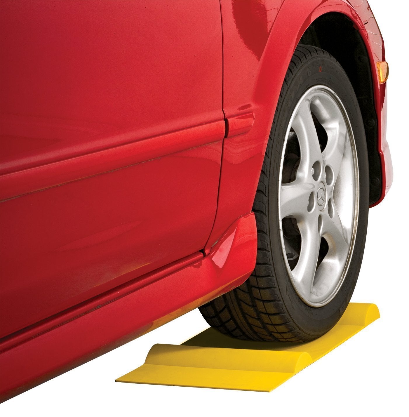 Automobiles can do a lot of damage to garage walls if parked incorrectly. And, garage doors can do a lot of damage to cars if they come down on top of them. Car Parking Mat guide helps you park perfectly every time so none of these things happen. The guide works with all types of cars and trucks. With only one mat needed per vehicle, wheels drop into place so that you're sure that you've driven far enough into your garage to clear the automatic door. Simply set the guide on the floor exactly where you want your front tires to stop. A unique tongue design makes it so the car's weight holds the guide in place. Drive over the first hump and you'll know it's time to stop when the tire comes to rest on the second.