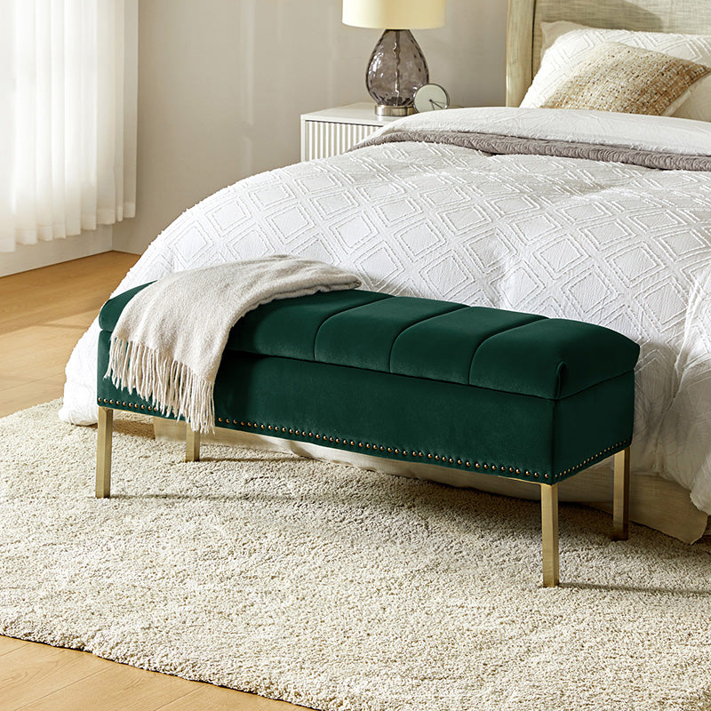 The modern velvet storage bench is both stylish and practical, making it an ideal addition to any home. Its sturdy structure, polyester fabric covering, and foam padding ensure both durability and comfort. The five-channel tufted and nailhead trim design of seat cushion adds sophistication and charm. With its flip-top feature, a spacious storage compartment is revealed, allowing for the convenient organization of various items. Whether placed in the entryway, living room, or bedroom, this bench seamlessly complements traditional, transitional, vintage, and classic home styles. Offering not only extra seating but also versatile storage, it serves as a functional and adaptable furniture piece.