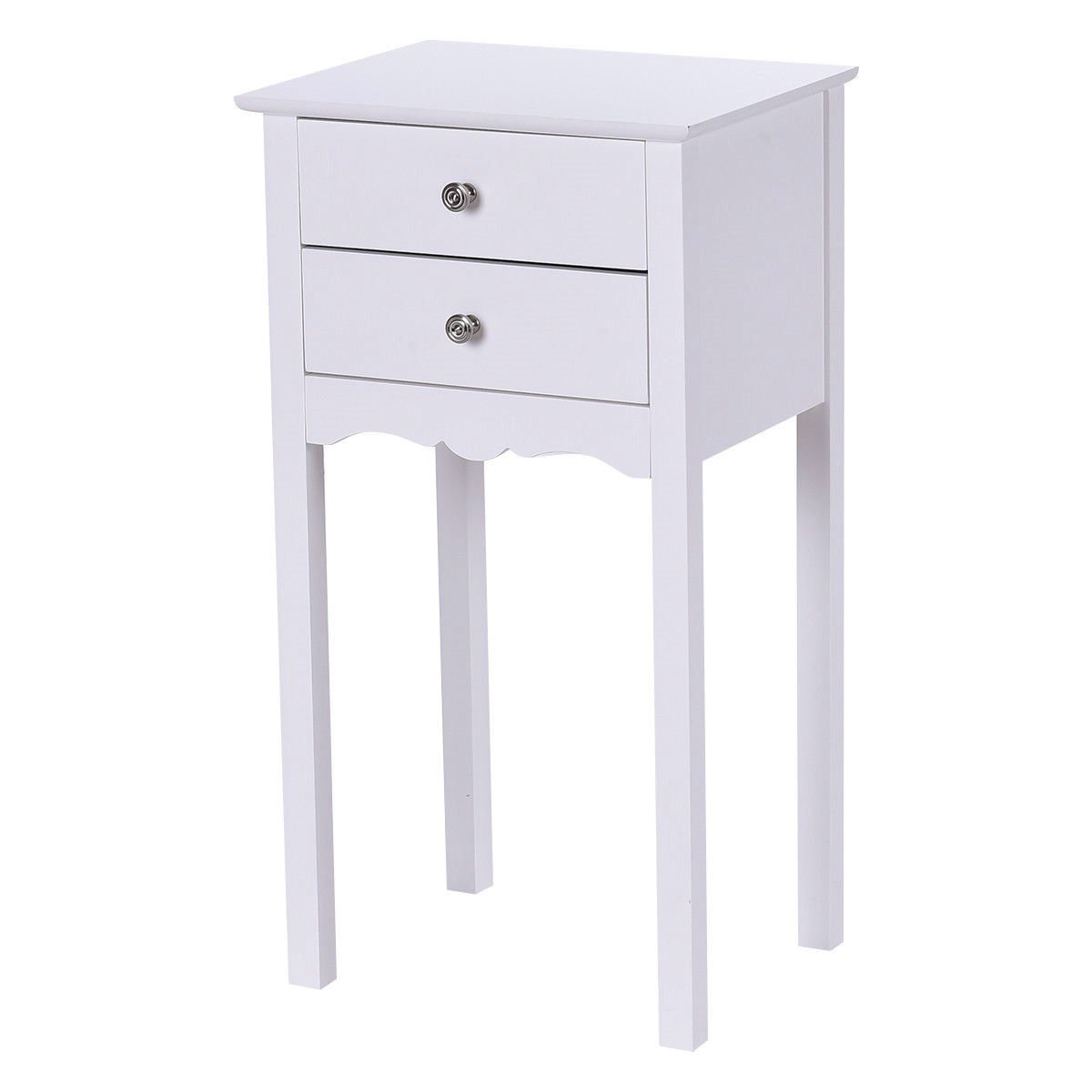 Elegant 2-Drawer End Table Nightstand Side Table in White Wood Finish Brand new and high quality Modern and elegant style Constructed of high quality, non-toxic MDF material with a high gloss on the surface Two slide-out drawers for additional storage Vintage style metal handles Used as a living room side table or a bedside table For college dorms, guest rooms or any room Wipe-clean surface, easy to clean Assembly required Color: Black/White Material: MDF Package include: 1 x Side table
