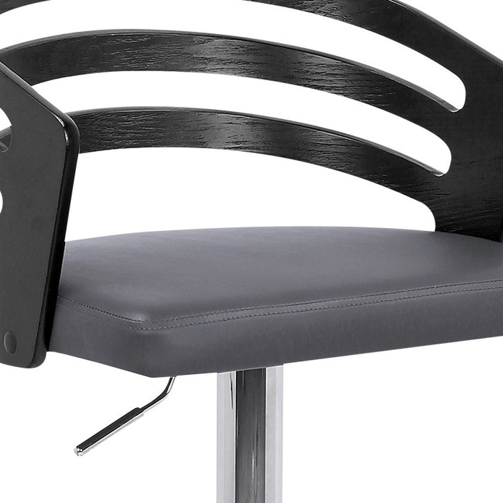 This stunning Gray Faux Leather Black Wood and Chrome Adjustable Swivel Bar Stool will keep your guests captivated. The nice-looking bar stool is adorned in faux leather and a curved black wood backrest, which perfectly complement the chrome base to create a perfect design for any modern decor with a nod to mid-century styling. With functionality being the major theme of this bar stool, it's only normal that the seat's height is adjustable, allowing you to determine how you sit and how comfortable you feel. The versatility of this stool makes it an appealing choice for your kitchen island or home bar, with the convenient swivel function carrying out the special task of keeping everyone engaged. The well-padded seat features high-density foam that guarantees comfort, which means you can spend longer periods on this stool and not feel any pain. All the elements combine well to make this a great choice for many. 44" x 19" x 19"