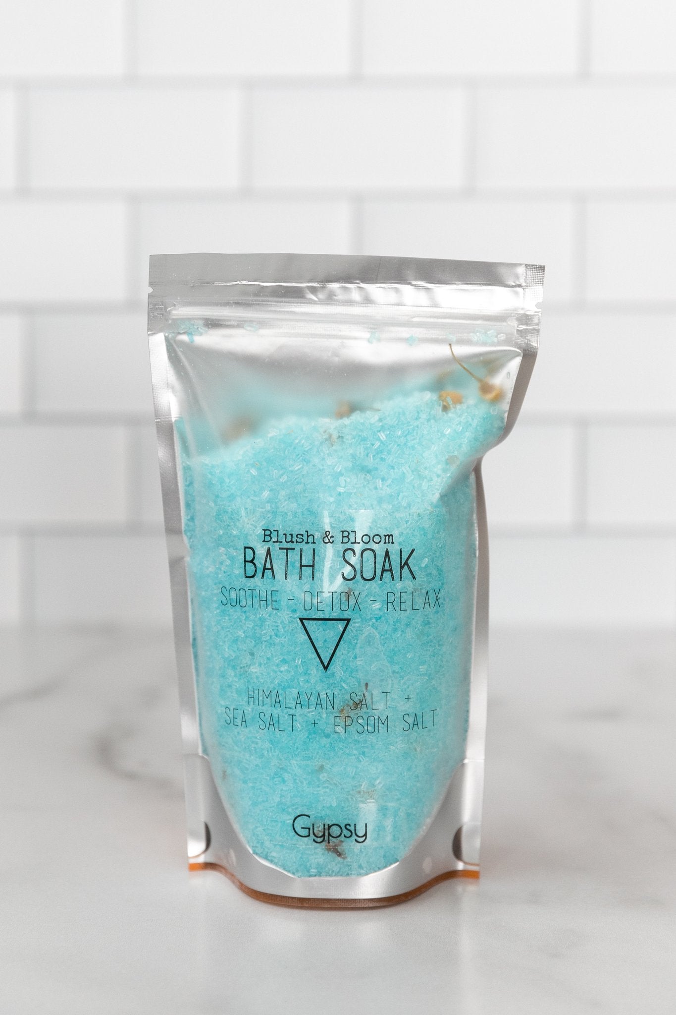 Lay back + relax + detox in a warm tub filled with Gypsy Bath Soak. A beautiful blend of Himalayan Salt + Dead Sea Salt + Epsom Salt and Chamomile flowers. Gypsy smells like a delightful blend of melon fruit with a drop of rum.