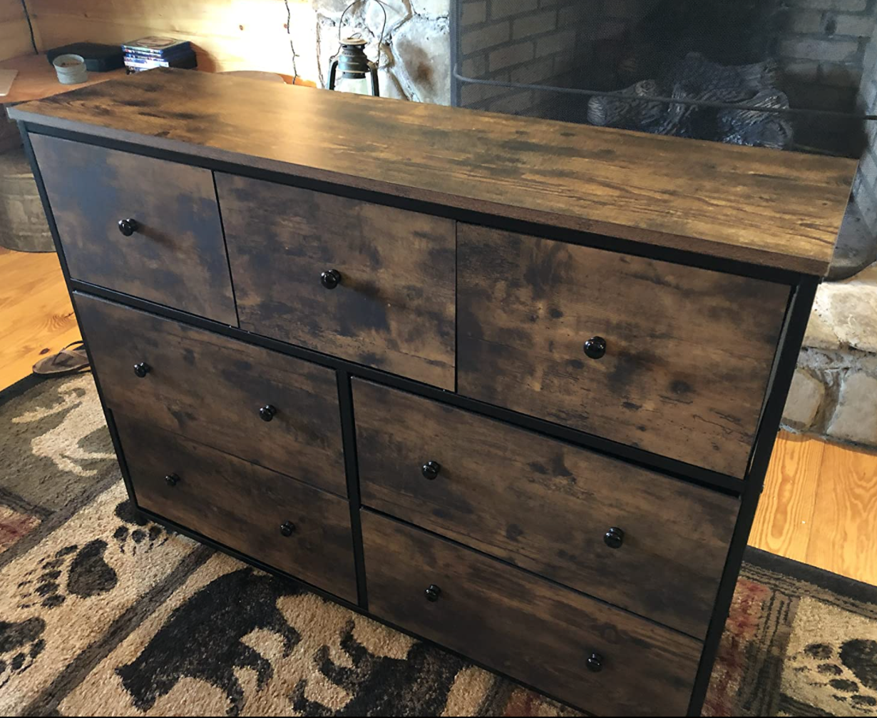 - Go Industrial: An instant industrial piece. The rustic brown veneer surface for a charming wood-look—so rustic. Matte black metal pipes for the frame—so cool. And this drawer dresser pulls the whole look together