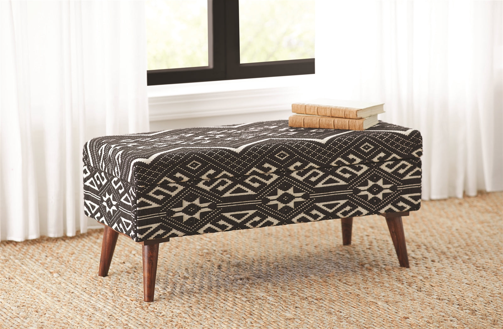 Embrace your funky side with this eclectic ottoman, featuring black and white to offer a complement to a wide variety of color schemes. The tribal motif pattern reminds of your love for travel and experiencing other cultures. Your friends will wonder which of your world-traveling adventures led you to this uniquely styled piece. Slim tapered legs are the one modern touch in this eclectic accent. Perfectly suitable to enhance an eclectic decor theme in any room.