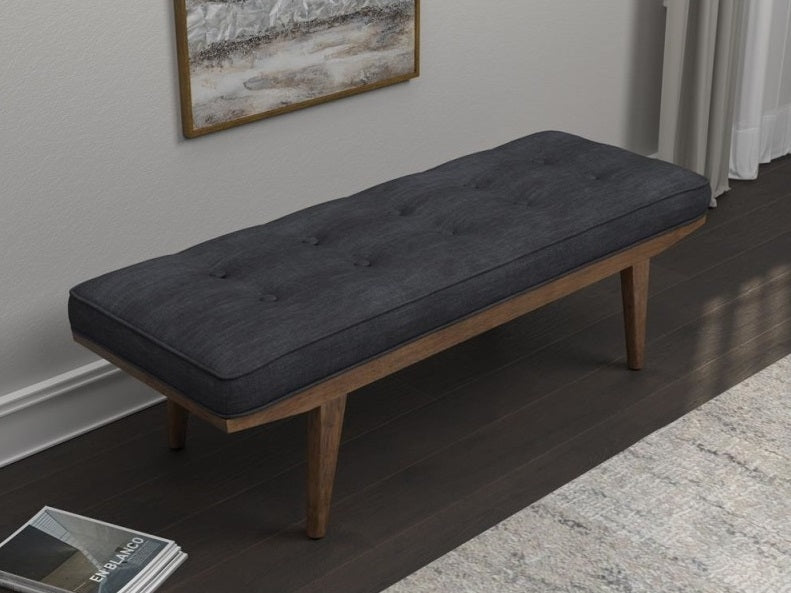 Perfect for a bedroom or entryway, this wooden bench is crafted for comfort and style. The attached seat cushion gives you a comfortable place to sit as you get ready to walk out the door. Angled legs add mid-century modern flair. Decorative button tufting gives it a classically beautiful look. Taupe fabric upholstery blends with a natural wood base for an eye-pleasing, two-tone look.