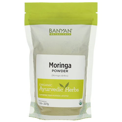 Moringa (Moringa oleifera) powder is made of the ground leaves of the moringa tree, a beloved drought resistant plant that has been used in Ayurveda for thousands of years. Also referred to as the drumstick tree because of the long and twisted seed pods it produces, moringa has a rich history across India and throughout the world due to its reputation as a miracle tree. Historically, various parts of the moringa tree have been used for everything from building materials, to water filtration, to traditional medicine, and everyday use as a nutrient dense food source. In classic Ayurvedic texts, moringa is called “sigru,” which means “moves like an arrow,” alluding to the herb’s ability to rapidly penetrate the tissues of the body to instigate deep cleansing and restoration.