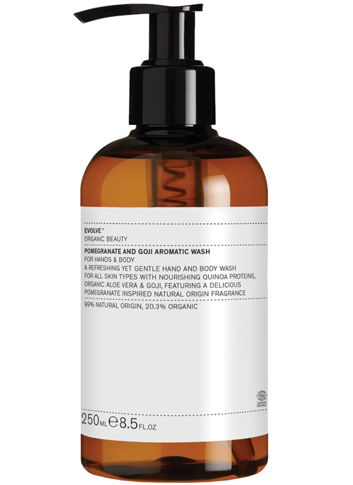 Evolve Pomegranate and Goji Aromatic Wash is an uplifting and deliciously fruity hand and body wash, lovingly hand blended with soothing Aloe Vera and moisture-locking Quinoa.