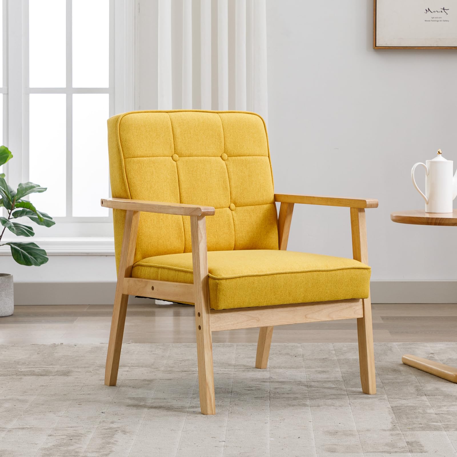 Mid Century Modern Accent Chair, Retro Wood and Fabric Armchairs Side Chair, Lounge Reading Comfy Arm Chair for Living Room, Bedroom, Office (Yellow)