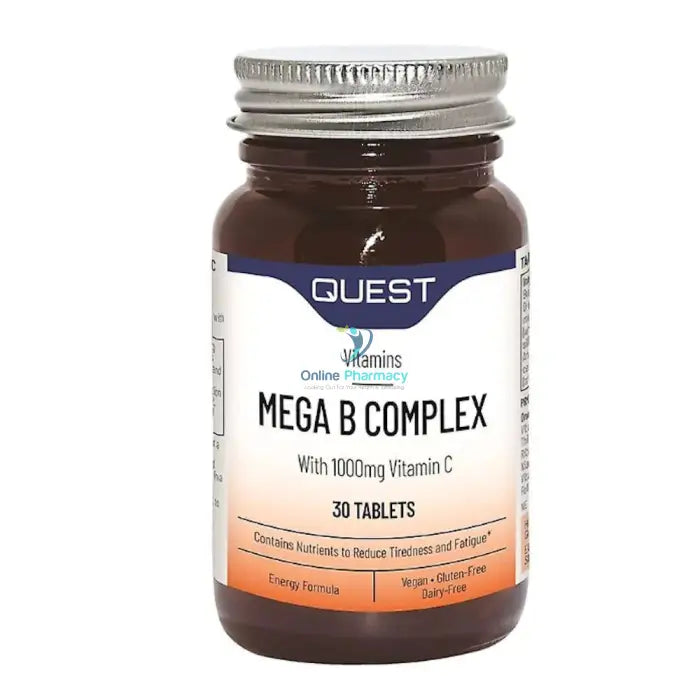 Quest Mega B Complex is a higher potency quick acting formula providing a full spectrum of the B vitamins plus vitamin C to support energy levels, the nervous system and psychological function.