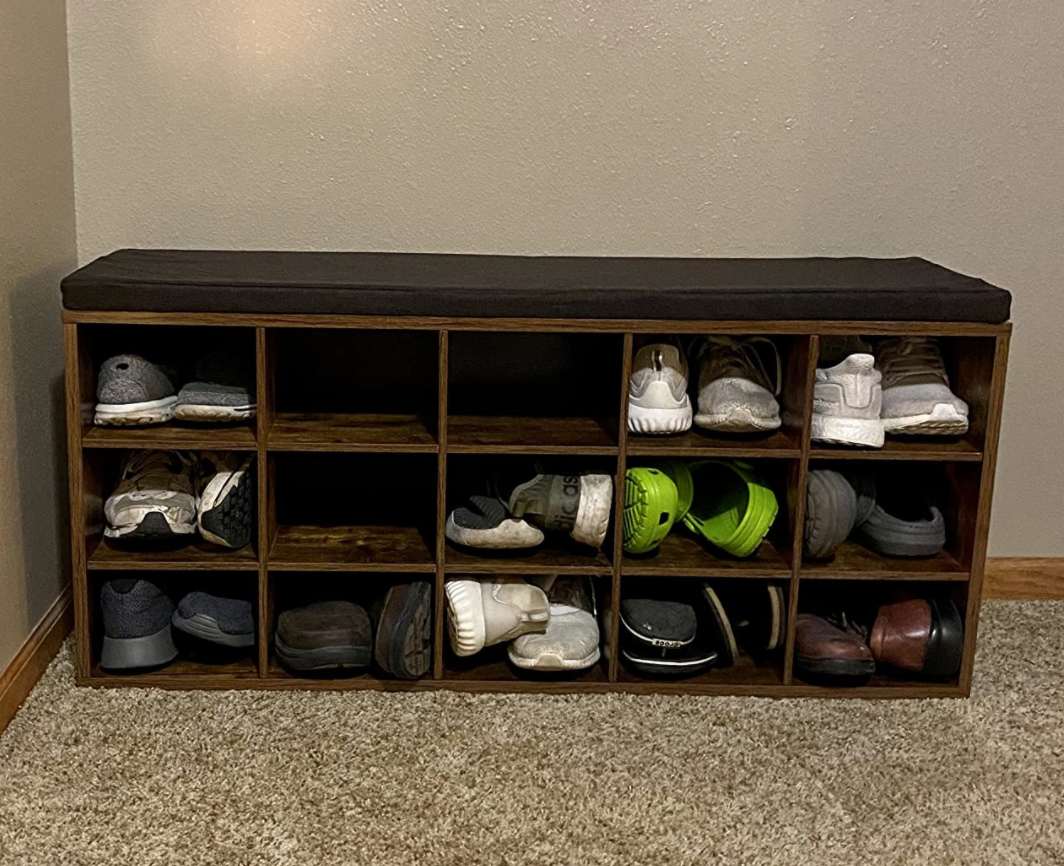 - WHAT YOU GET: A cushioned shoe bench for comfortable sitting when change shoes and 15 shoe storage cubes for an organized entryway