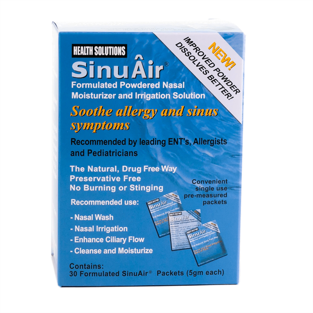 SinuAir Powdered Nasal Moisturizer & Irrigation Solution is a saline mix for nasal moisturizing and sinus irrigation. Recommended by leading health care professionals for sinus and allergy relief - including sinus infection, sinusitis, and post nasal drip. For use as both a nasal spray and sinus irrigation solution SinuAir is formulated to approximate the body's natural saline.