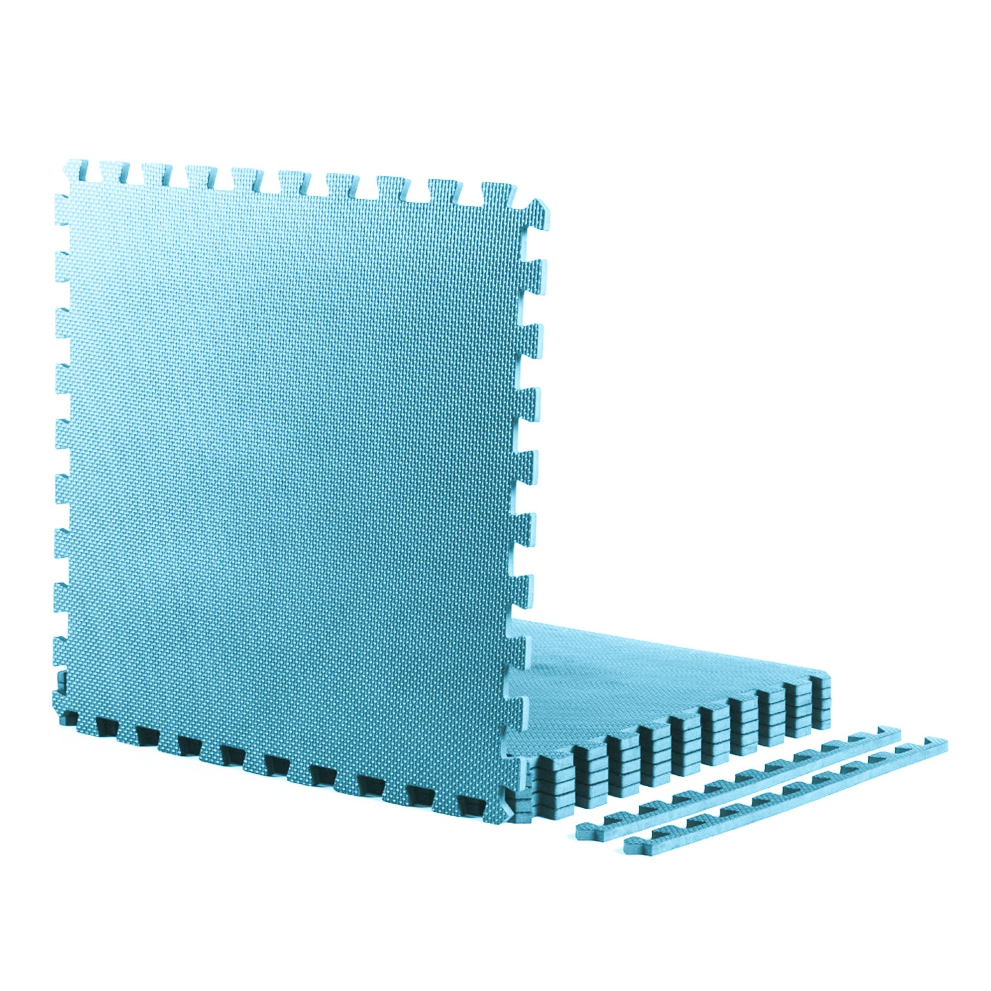 PROTECTIVE AND DURABLE: These high-density foam flooring tiles cover flooring to prevent scratches and dents. Each 6 pieces of 0.5" Thick Sky Blue 2' x 2' interlocking foam tile will cover 24 sq. ft.