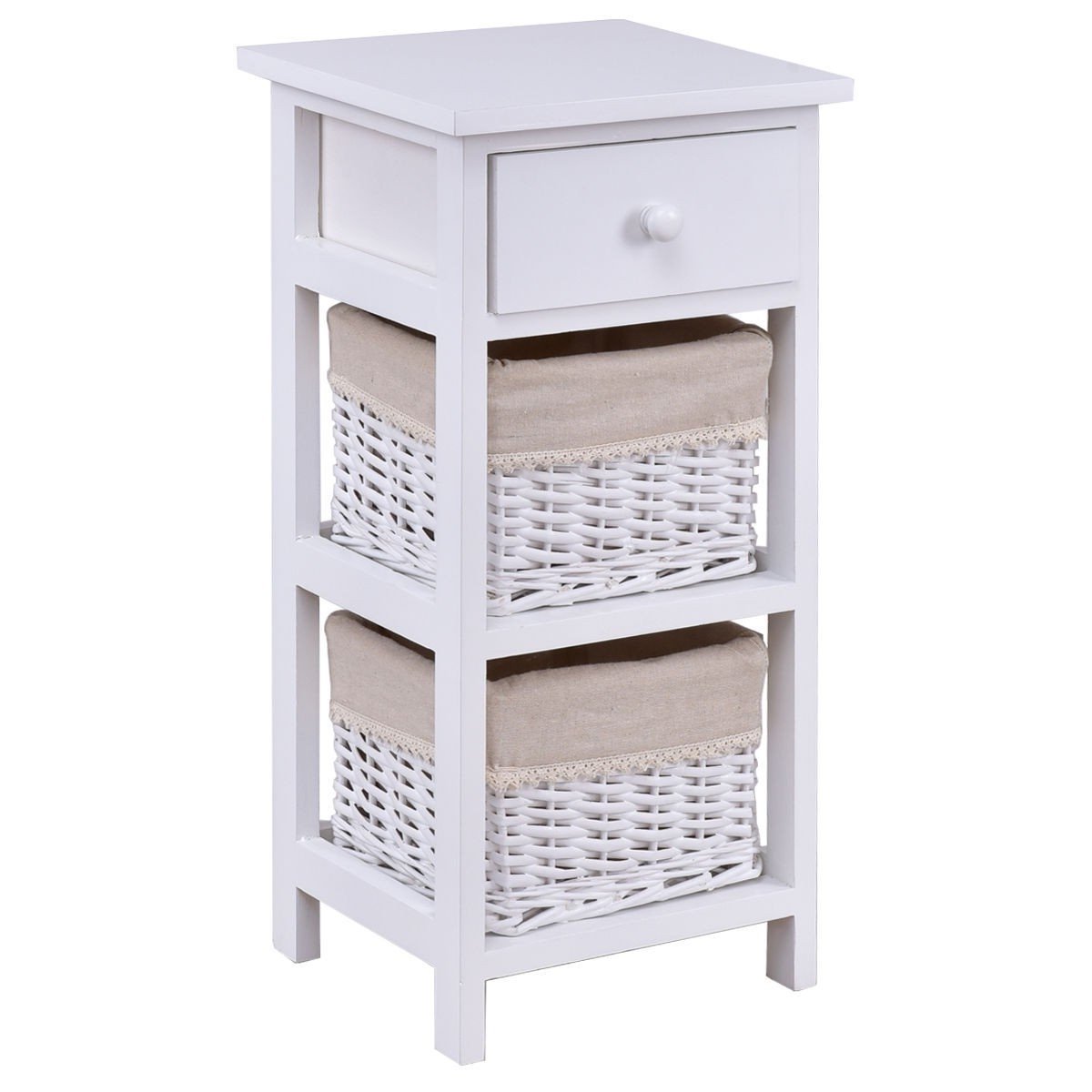 White Wood 1-Drawer End Table Nightstand with 2 Wicker Baskets