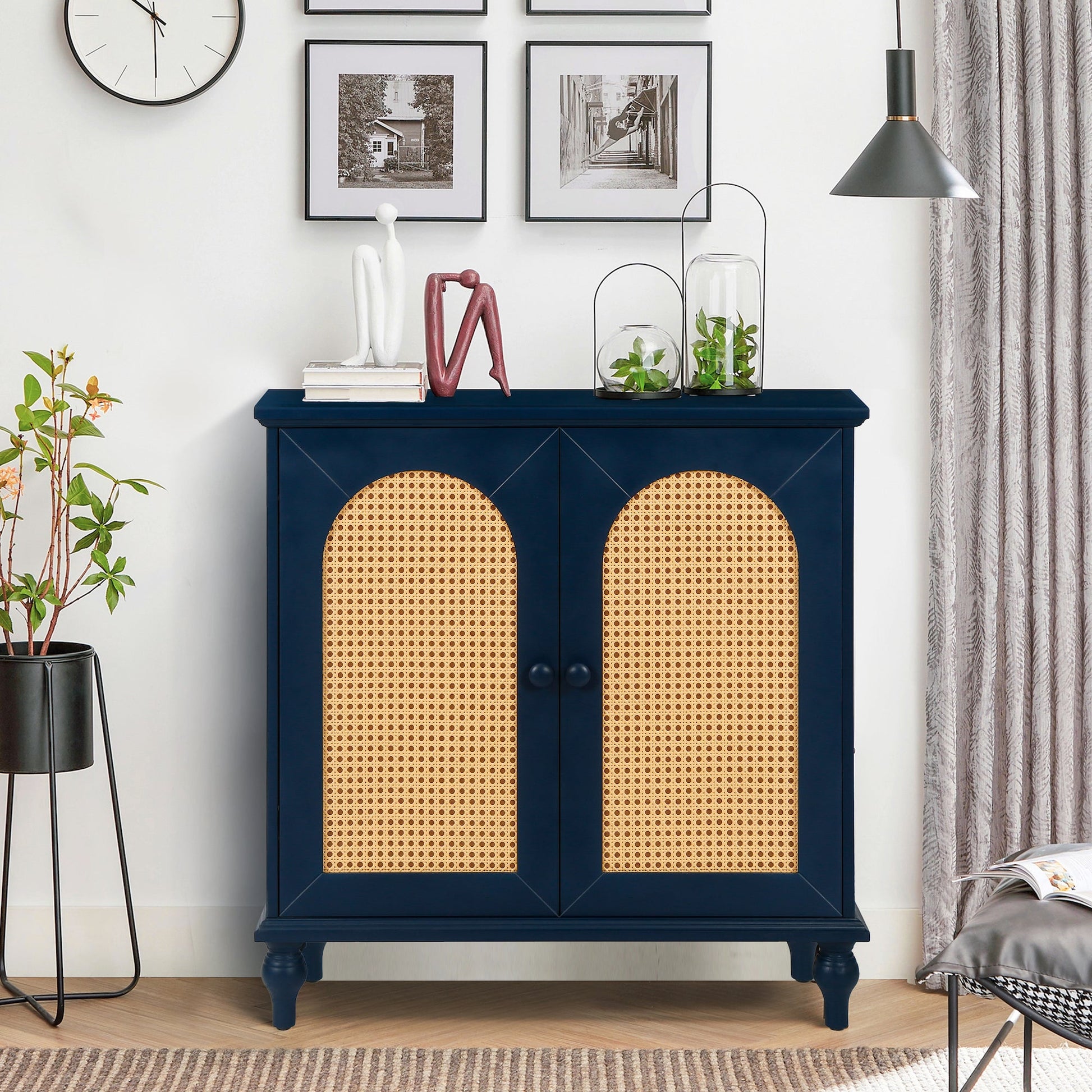 Zrun 2-Door Wooden Accent Cabinet with Rattan Fronts - Antique Blue